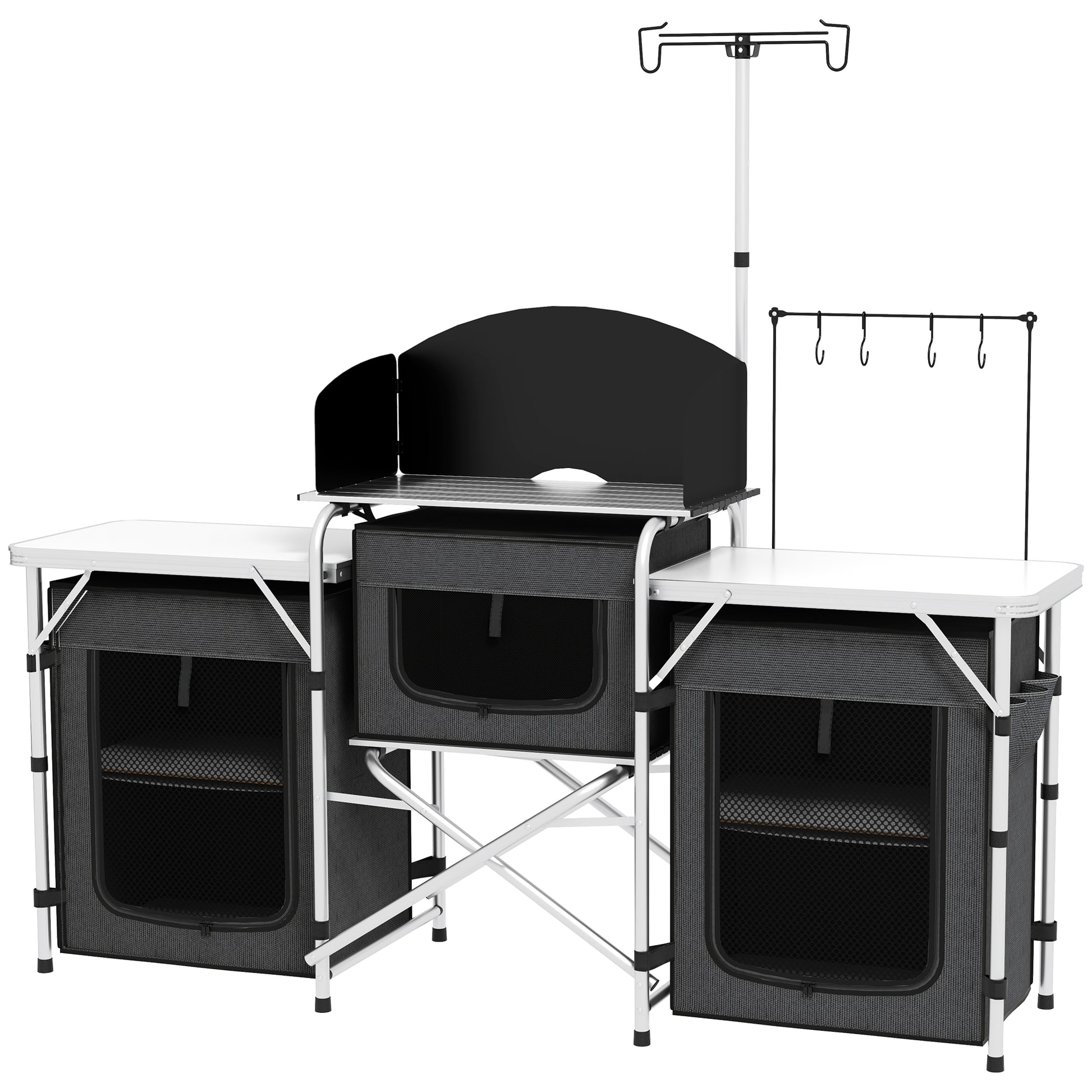 Aluminum Camping Kitchen, Portable Folding Camping Table with Fabric Cupboards, Windshield, Bag for BBQ, Picnic, Black